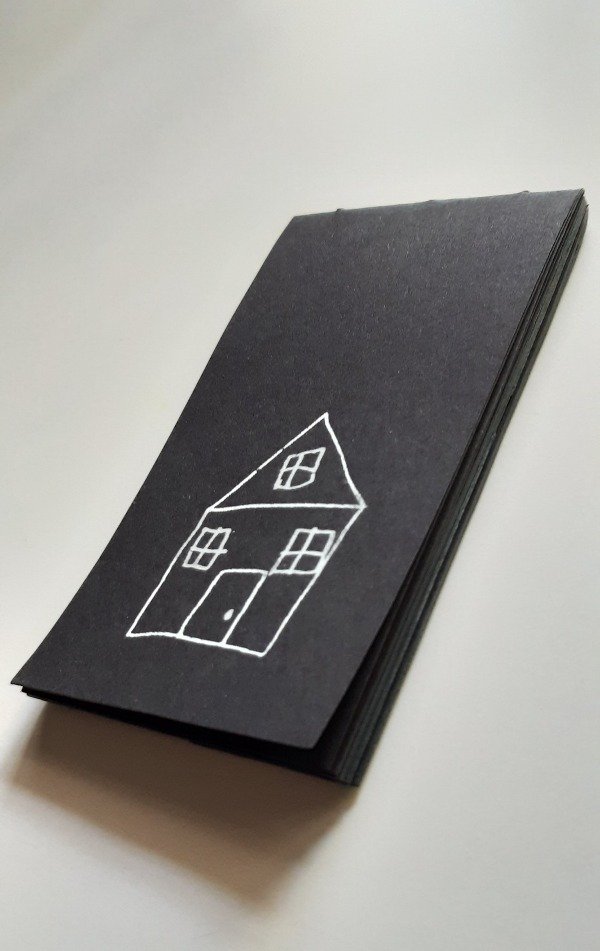 libreta de hojas negras en cartulina italiana de 140 g. Costura a mano con hilo negro de lino. Serigrafía artesanal en pigmento blanco. Medidas: 13 x 7 cms. Única.