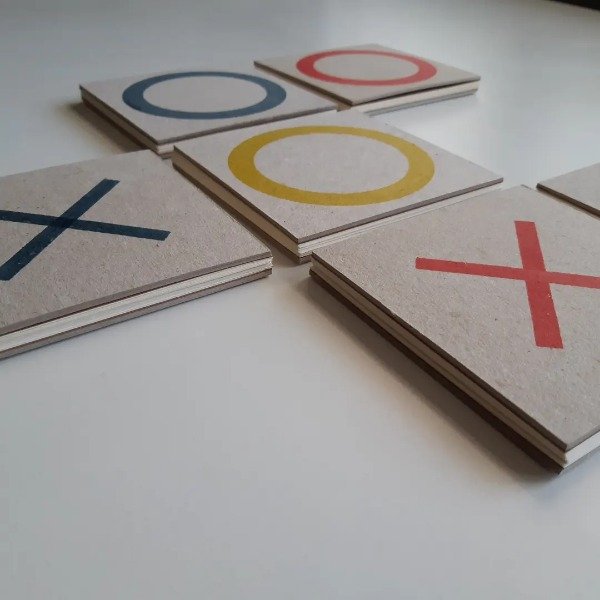 libretas de hojas lisas de papel sin blanquear. 80 páginas, costura a mano con hilo de lino. Tapas de cartón gris de 2 mm con estampa a mano en serigrafía a una tinta y guardas de cartulina negra italiana teñida en masa. Varios colores.