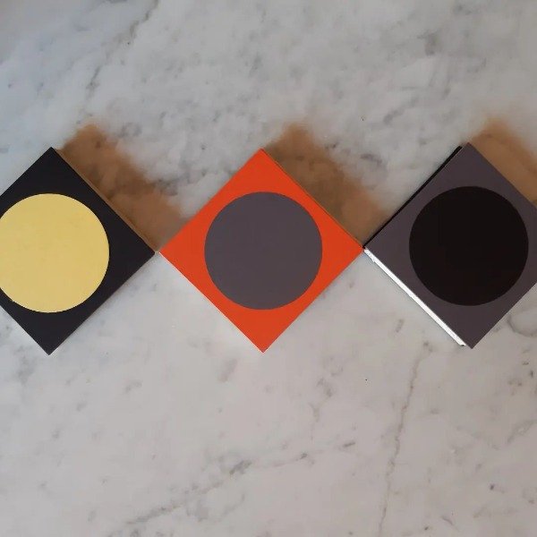 formato cuadrado, 40 hojas de caña de azúcar de 75 g, cosidas a mano con hilo de lino, tapas de cartón de 1,5 mm laminadas y con detalle de mosaico en tapa y contratapa. Las medidas son 8,5 x 8,5 cms. SIN STOCK